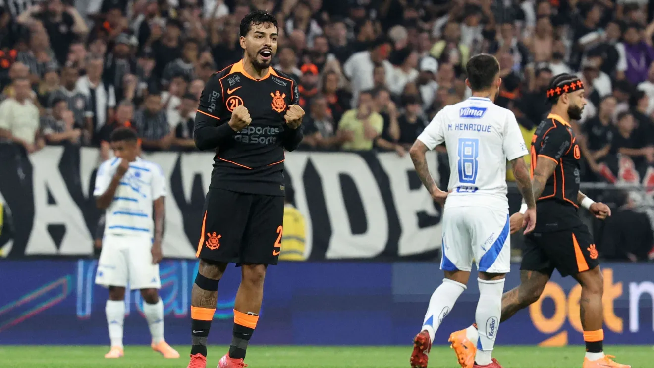 Matheus Bidu, do Corinthians, celebrando o seu gol contra o Cruzeiro, em partida válida pelo jogo de volta da semifinal da Copa do Brasil • LUIS MOURA/WPP/ESTADÃO CONTEÚDO