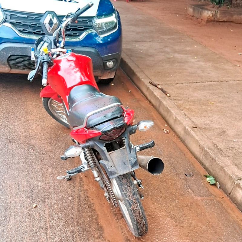 Quando a viatura se aproximou da área, os policiais visualizaram uma motocicleta vermelha circulando sem placa de identificação. Nesse momento, a equipe decidiu realizar a abordagem do condutor.