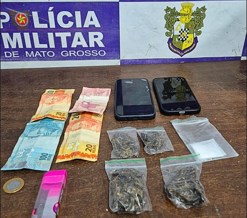 Os militares realizaram busca completa no interior do veículo durante a abordagem. A revista identificou quatro porções de maconha e duas de cocaína apreendidas pelos policiais. Também foi localizado R$ 151 em dinheiro trocado, aspecto típico de atividades ligadas ao comércio de substâncias ilícitas.