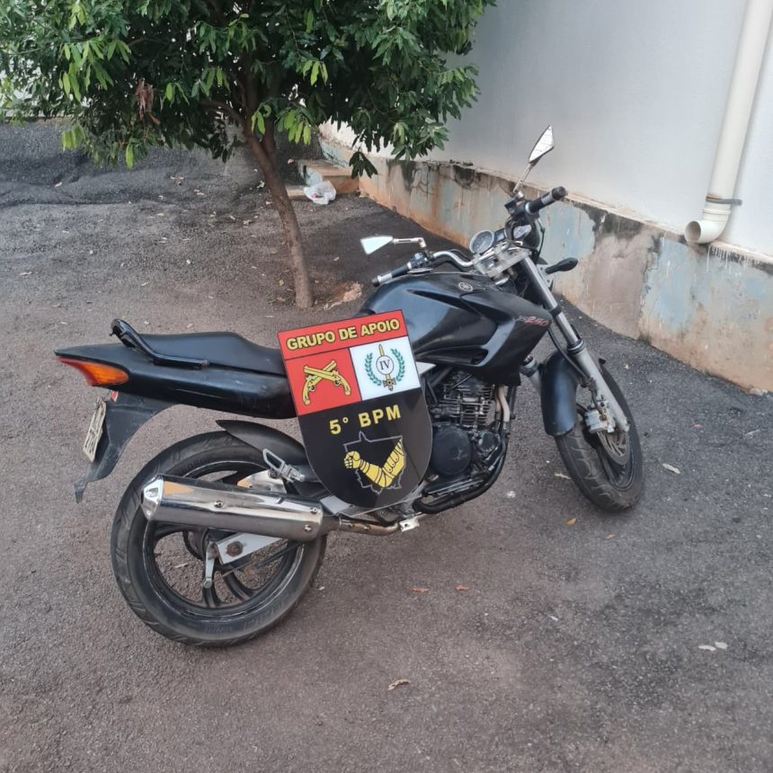 A Polícia Militar localizou uma motocicleta com registro de roubo no domingo (12/04), em Rondonópolis. A guarnição patrulhava a Rodovia do Peixe quando avistou o veículo estacionado em local isolado.
